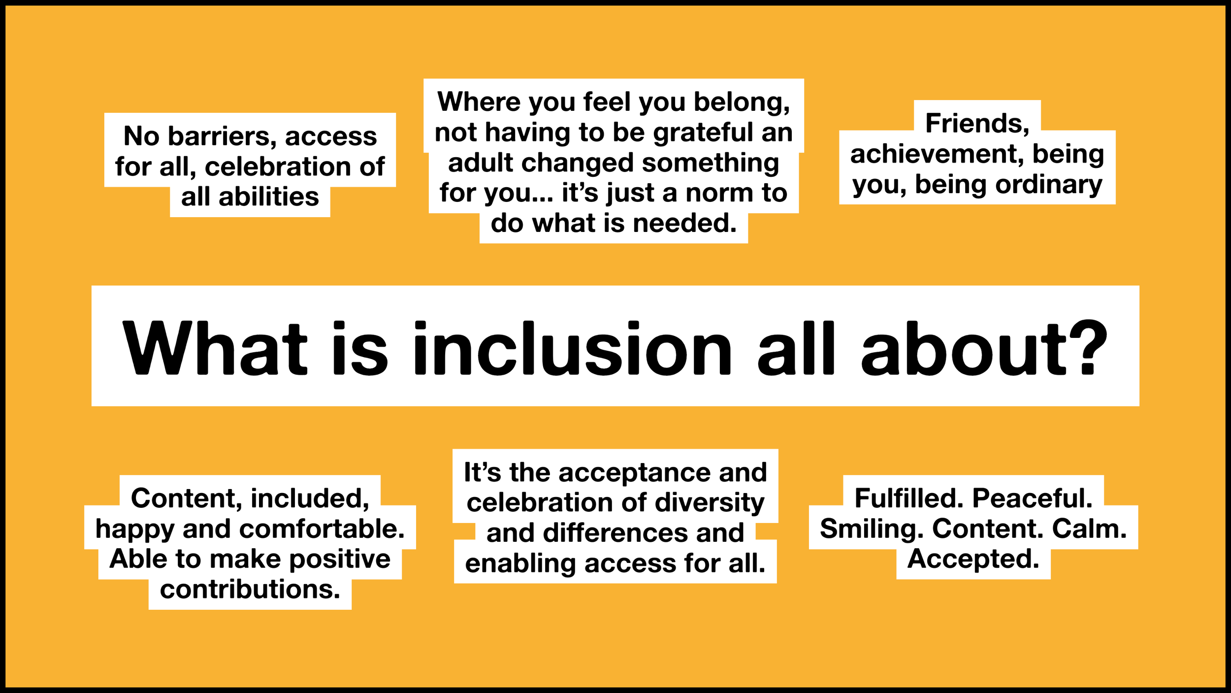 [Image Description: This is an infographic on an orange background with the main question "What is inclusion all about?" displayed in large black text on a white banner across the centre. Surrounding this central question are six white text boxes containing key aspects of inclusion: "No barriers, access for all, celebration of all abilities" (top left), "Where you feel you belong, not having to be grateful an adult changed something for you... it's just a norm to do what is needed" (top centre), "Friends, achievement, being you, being ordinary" (top right), "Content, included, happy and comfortable. Able to make positive contributions" (bottom left), "It's the acceptance and celebration of diversity and differences and enabling access for all" (bottom centre), and "Fulfilled. Peaceful. Smiling. Content. Calm. Accepted" (bottom right).]
